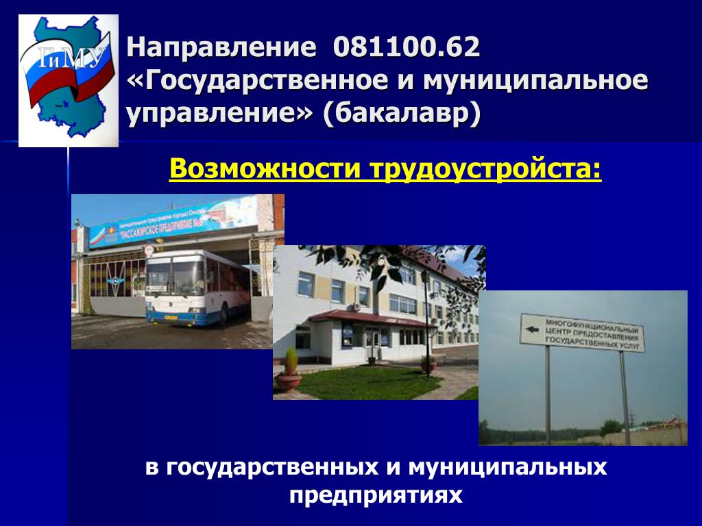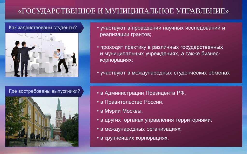 Работа государственного и муниципального служащего в условиях рыночных методов хозяйствования требует умения творчески мыслить, свободно ориентироваться в конкретных социально-экономических ситуациях, рационально решать управленческие проблемы соответствующего уровня власти. Профессиональная деятельность специалиста в области государственного и муниципального управления может осуществляться в органах государственного и муниципального управления, государственных организациях и предприятиях, муниципальных структурах.