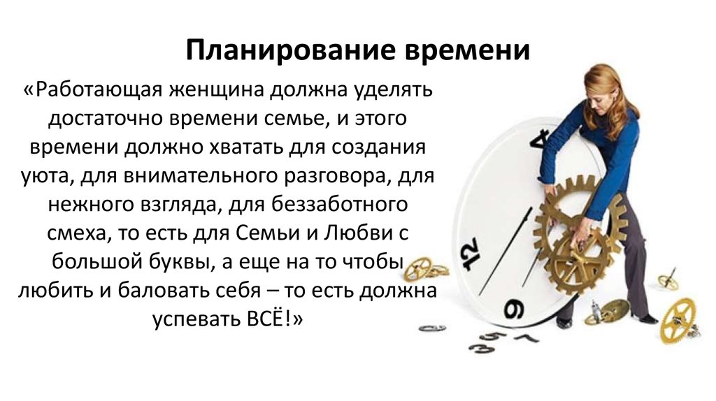 Старайтесь планировать в деталях свою неделю и день. Планирование дня начните с составления списка задач — «To Do List». Далее определите, сколько времени займет выполнение того или иного дела, в какой промежуток времени лучше вставить задачу и когда нужно ее завершить.