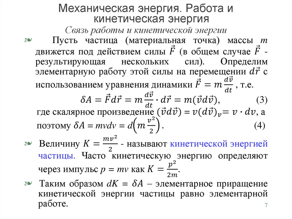 Движущееся тело способно совершать работу посредством своего движения. Кинетическая энергия прямо пропорциональна квадрату скорости тела. Кинетическая энергия определяется как: