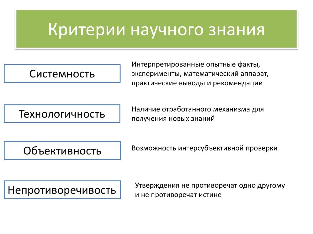 - есть интуитивно понятный критерий, позволяющий установить, соответствуют ли знания действительности;