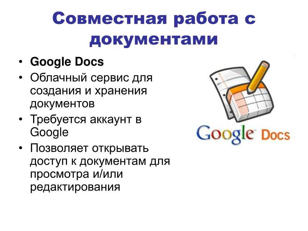 Google Docs – это облачный продукт Google со всеми функциями, необходимыми для создания, редактирования и обмена документами. Интеграция с облачным хранилищем Google Диска позволяет получать доступ к документам и работать с ними из любого места. Пользоваться документами Google можно как на компьютере, так и на смартфонах Android, iPhone и iPad.