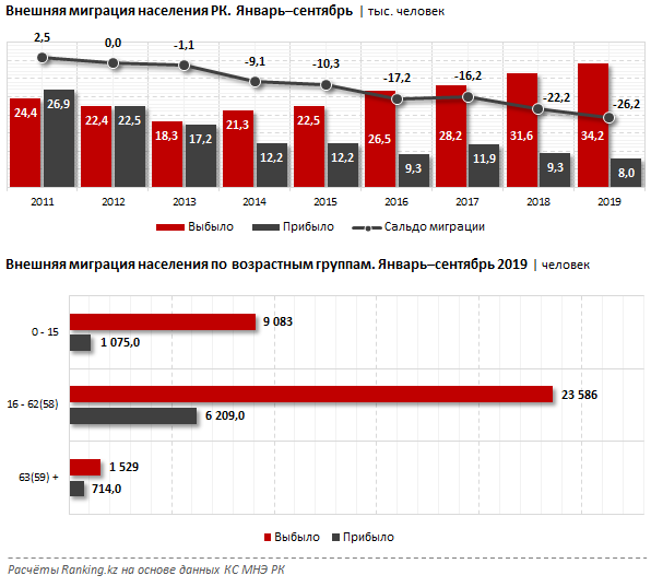 Более 80 % эмигрантов, большинство из которых статистика определяет как этнических русских, выезжают в Россию. Этнические немцы и украинцы составляют 7-8 % и 6-7 % эмиграционного потока соответственно. Аналогичная тенденция этнической эмиграции, хотя и в гораздо большем масштабе, наблюдалась в 1990-е годы после распада Советского Союза. Хотя причины ускоренного этнического исхода различаются, эксперты склонны соглашаться с тем, что социально-экономические факторы играют, пожалуй, главную роль. Это также объясняет растущую долю этнических казахов среди мигрантов, уезжающих в основном в Россию и Германию в поисках лучших экономических и образовательных возможностей.