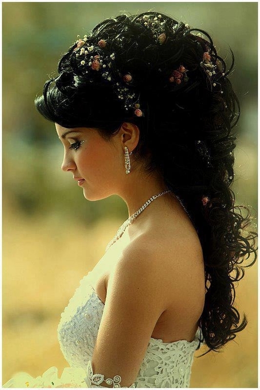 Эта свадебная прическа доказывает, как хорошо открытые волосы смотрятся с вашим свадебным нарядом. Мне, например, очень нравятся эти объемные распущенные кудри, украшенные милыми цветочками! Это может быть ваша праздничная прическа до или после свадьбы.
