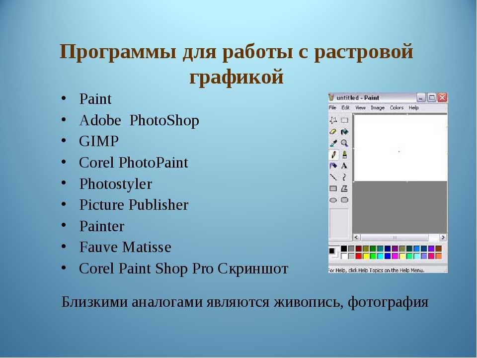 Растровые редакторы больше подходят для ретуши, обработки фотографий, фотореалистичных иллюстраций, коллажей и иллюстраций, нарисованных от руки с помощью графического планшета. Многие современные иллюстраторы используют Corel Photo-Paint и Photoshop для создания всевозможных иллюстраций. Последние версии редакторов растровых изображений, таких как GIMP и Photoshop, поддерживают векторные инструменты (например, редактируемые пути), а векторные редакторы, такие как CorelDRAW, Adobe Illustrator, Xara Xtreme, Adobe Fireworks, Inkscape или SK1, используют растровые эффекты, которые когда-то были ограничены редакторами растровых изображений ( например, проблема размытия).