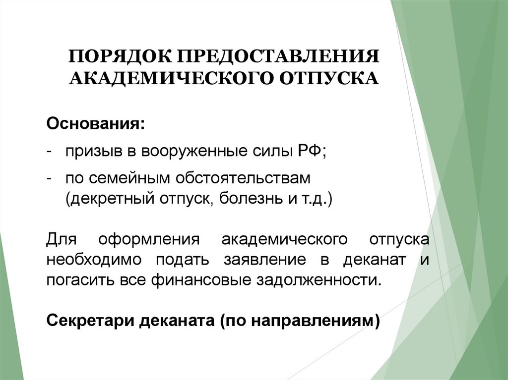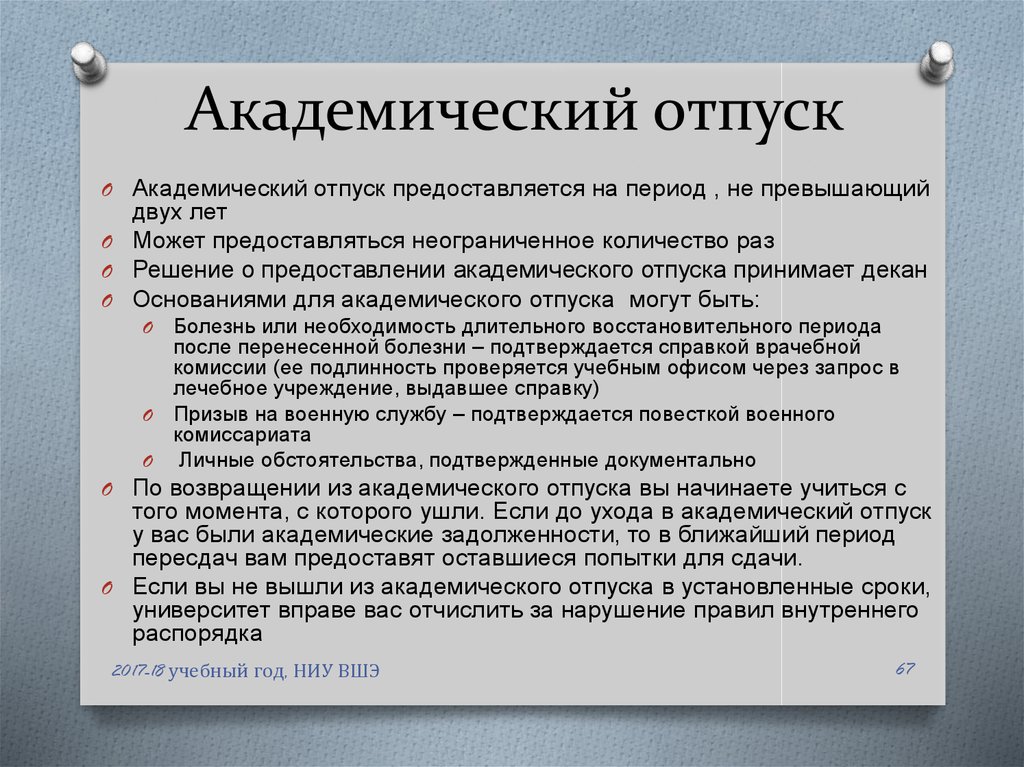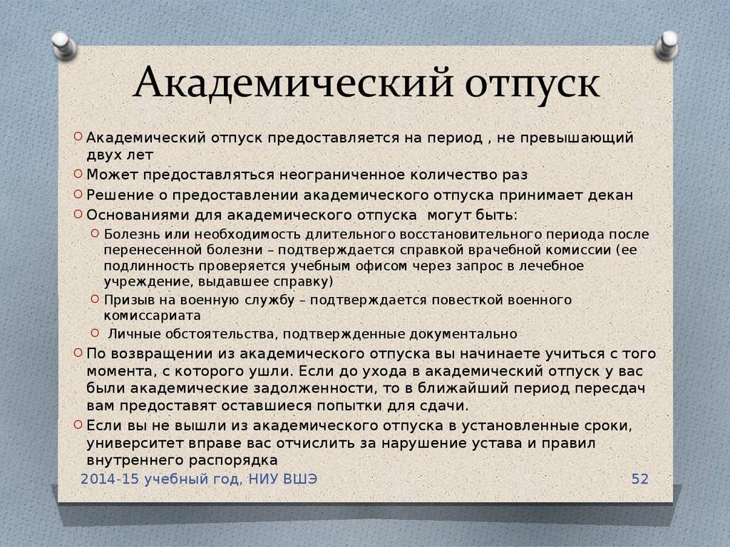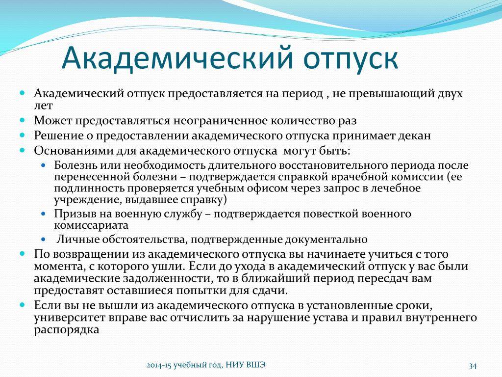 - Академ предоставляется по медицинским показателям, в случае беременности, при возникновении нестандартных семейных обстоятельств или по другим причинам.