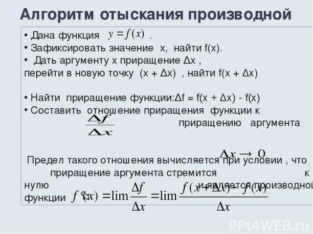Математический анализ, ядро которого составляют дифференциальное и интегральное исчисление – самая тонкая область всей математики. Раздел математики, в котором изучаются производные и их применение к исследованию функций, называется дифференциальным исчислением.