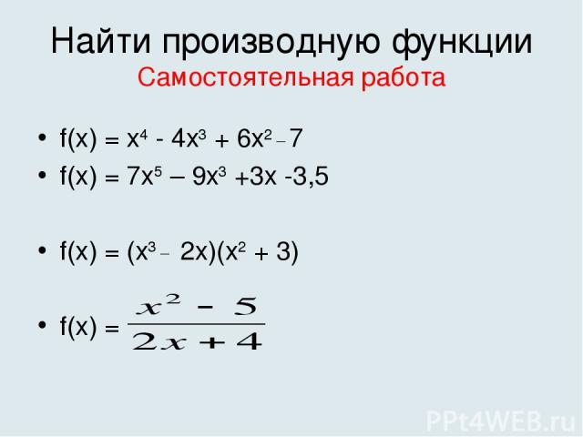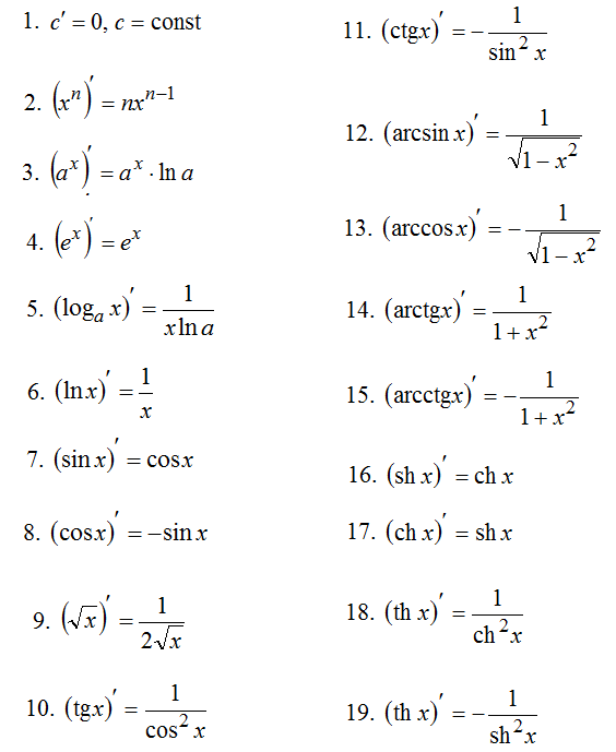 б) Вспомнить формулы и правила нахождения производных (таблица на доске).
