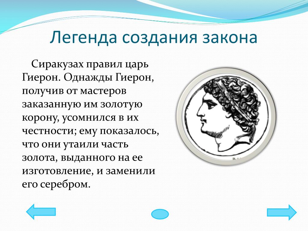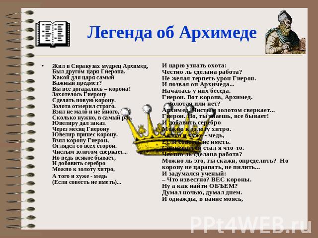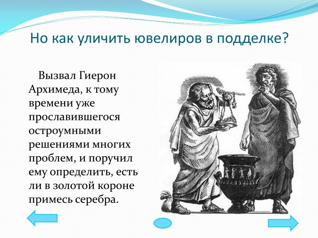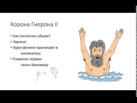 до н.э. королевская корона. Так родился винт Архимеда: когда крутили ручку, шла вода. Говорят, что Архимед открыл законы плавучести, когда царь Сиракуз Гиерон попросил определить, была ли его новая корона из чистого золота (SG = 19.3). Король Иеро II ожидал нападения. Архимед и золотая корона 阿基米德与金皇冠 Однажды в Древней Греции царь Гиерон попросил мастера сделать ему золотую корону. Он говорит, что Архимед добился такой известности из-за своего родства с царем Гиероном II и Гелоном (сыном царя Гиерона II). Архимед, возможно, также был связан с королем Сиракуз Гиероном II. IV век до нашей эры Венок и золотой самородок имеют одинаковый вес Венок вытесняет больше воды, чем золотой самородок В первом веке до нашей эры римский архитектор Витрувий рассказал историю о том, как Архимед раскрыл мошенничество при изготовлении золотой короны по заказу Гиерона. II, король Сиракуз. SS Archimedes был кораблем, названным в честь великого изобретателя, который был первым пароходом с гребным винтом. Гиерон отвесил точное количество золота и, назначив ювелира, приказал ему вылепить из золота венок, достойный богов.