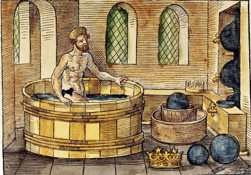 Войдя в ванну, Архимед заметил, что уровень воды поднялся: он сразу сделал вывод, что объем вытесненной воды должен быть равен объему части его тела, которую он погрузил в воду.
