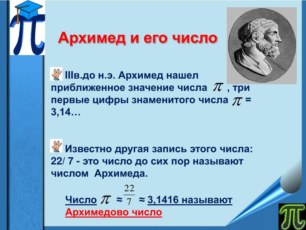 В работе «Об измерении круга» Архимед дал своё знаменитое приближение числа π: «архимедово число».