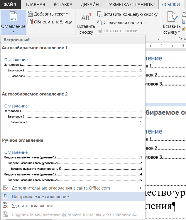 Вернувшись на вкладку «Ссылки», еще раз выберите меню «Оглавление». В параметрах «Оглавление» выберите «Пользовательское оглавление».