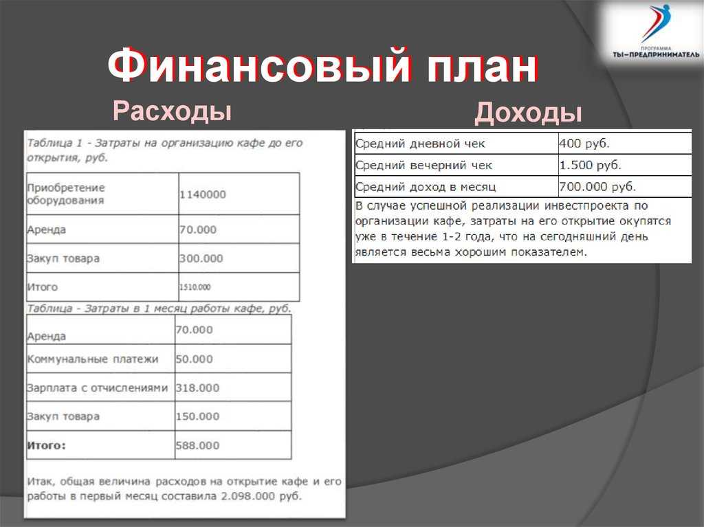 - Составление бизнес-плана с указанием таких экономических показателей как срок окупаемости, точка безубыточности, план доходов и расходов.