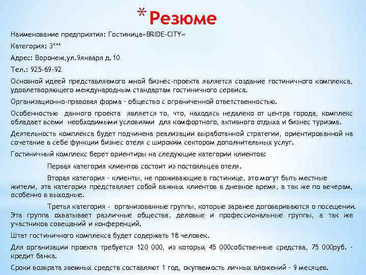 - предоставление услуг по защите бизнес-плана, его корректировке в случае необходимости.