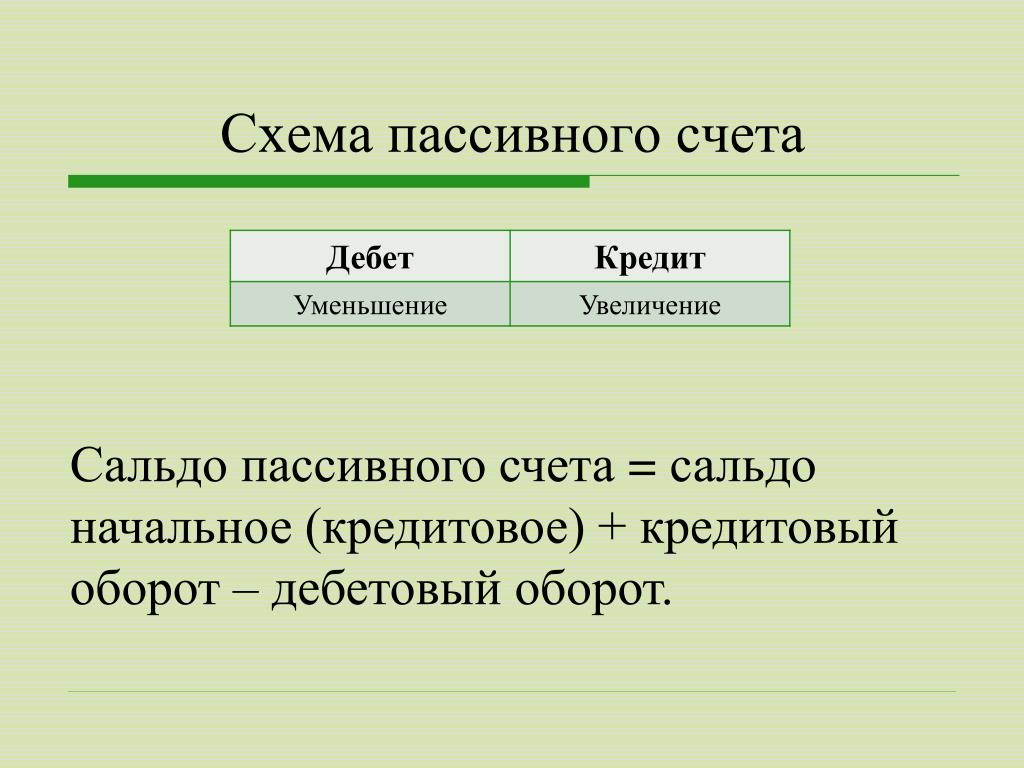 У активных счетов дебетом является приход, а кредитом расход средств. Для пассивных: кредит — приход, дебет — расход.