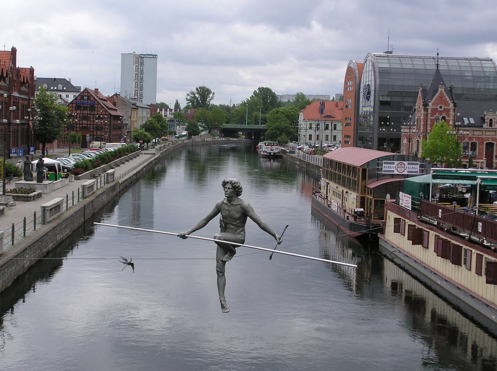 Пересеките реку Брда в Мостове, чтобы мельком увидеть самого известного смельчака Быдгоща: Канатоходца.