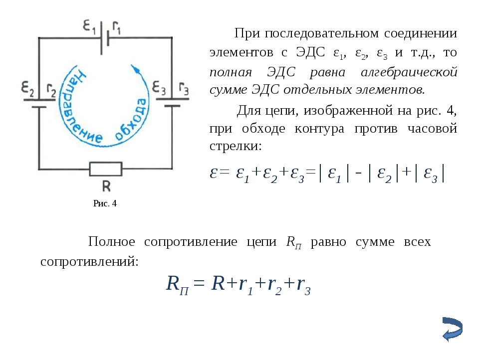 Если цепь содержит несколько последовательно соединенных элементов с то полная ЭДС цепи равна алгебраической сумме ЭДС отдельных элементов. Для определения знака ЭДС любого источника нужно вначале условиться относительно выбора положительного направления обхода контура. На рисунке 162 положительным (произвольно) считает направление обхода против часовой стрелки.