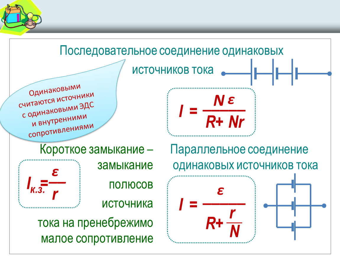 Сила тока в замкнутой электрической цепи с последовательно соединенными источниками тока прямо пропорциональна сумме ихЭДС и обратно пропорционально сопротивлению цепи.