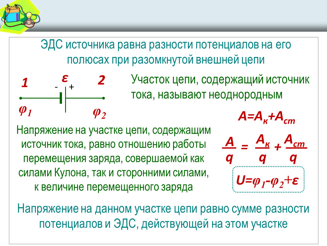 Так как для однородного участка цепи разность потенциалов есть напряжение, то \(~\varphi_1 – \varphi_2 = IR = U\) и формулу (1) можно записать: