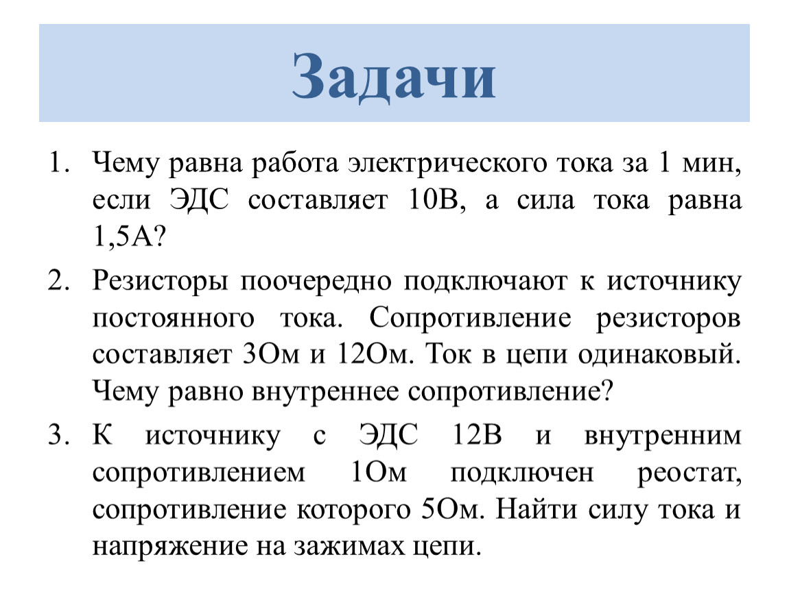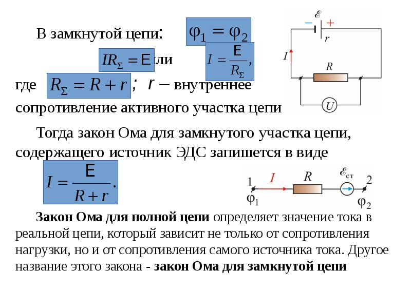 Последняя формула представляет собой закон Ома для замкнутой цепи постоянного тока. Сила тока в цепи прямо пропорциональна ЭДС источника и обратно пропорциональна полному сопротивлению цепи .