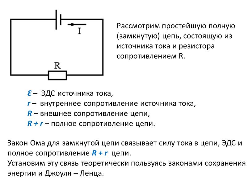 где E (также обозначается как «ԑ») — ЭДС; R – сопротивление нагрузки, r – внутреннее сопротивление источника электропитания, I – ток в цепи.