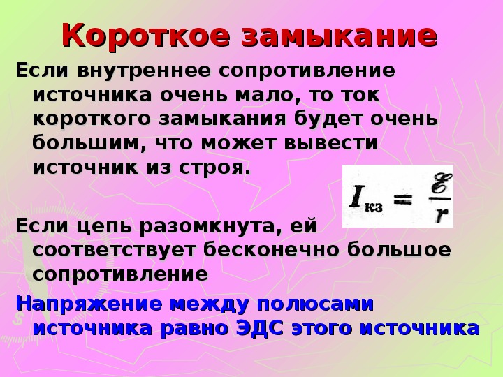 Но при коротком замыкании сила тока в цепи определяется именно внутренним сопротивлением источника и может при электродвижущей силе в несколько вольт быть очень большой, если мало (например, у аккумулятора Ом).