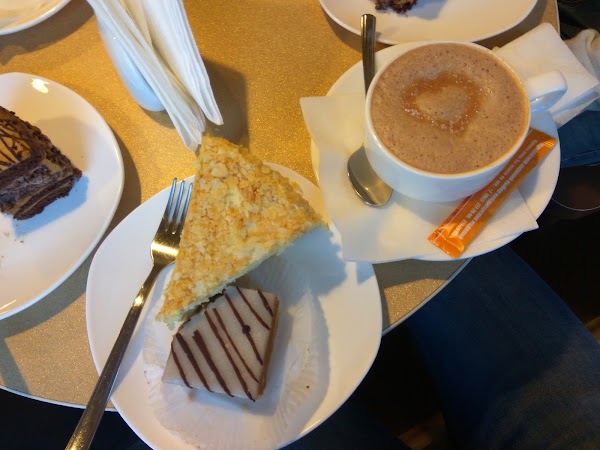Здесь подают кофе, чай, выпечку, кексы, закуски, сэндвичи с деликатесами и бутерброды Panini.