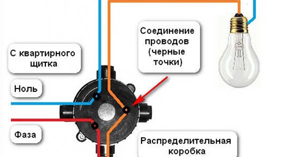 Резюмируя вышесказанное, можно без всяких оговорок и допущений утверждать, что разрываться должна только фаза на выключателе. Для этого из распаечной коробки на один контакт выключателя подается фаза от общего фазного проводника, а на второй провод от фазного контакта светильника. Соответственно, на второй контакт светильника подается «постоянный» ноль.