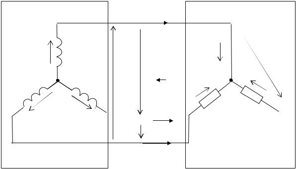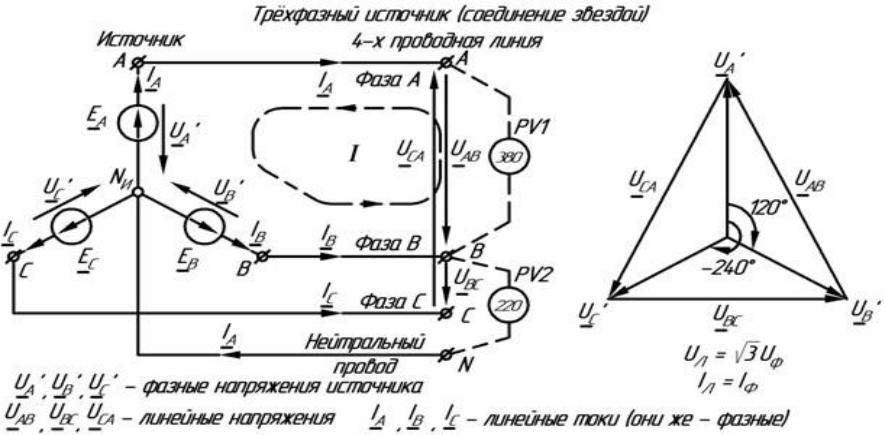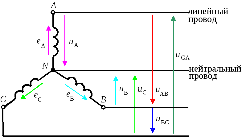 Где-то установлен генератор, на обмотках которого наводится ЭДС. Концы обмоток соединены в общую точку. Такое соединение называется звездой.