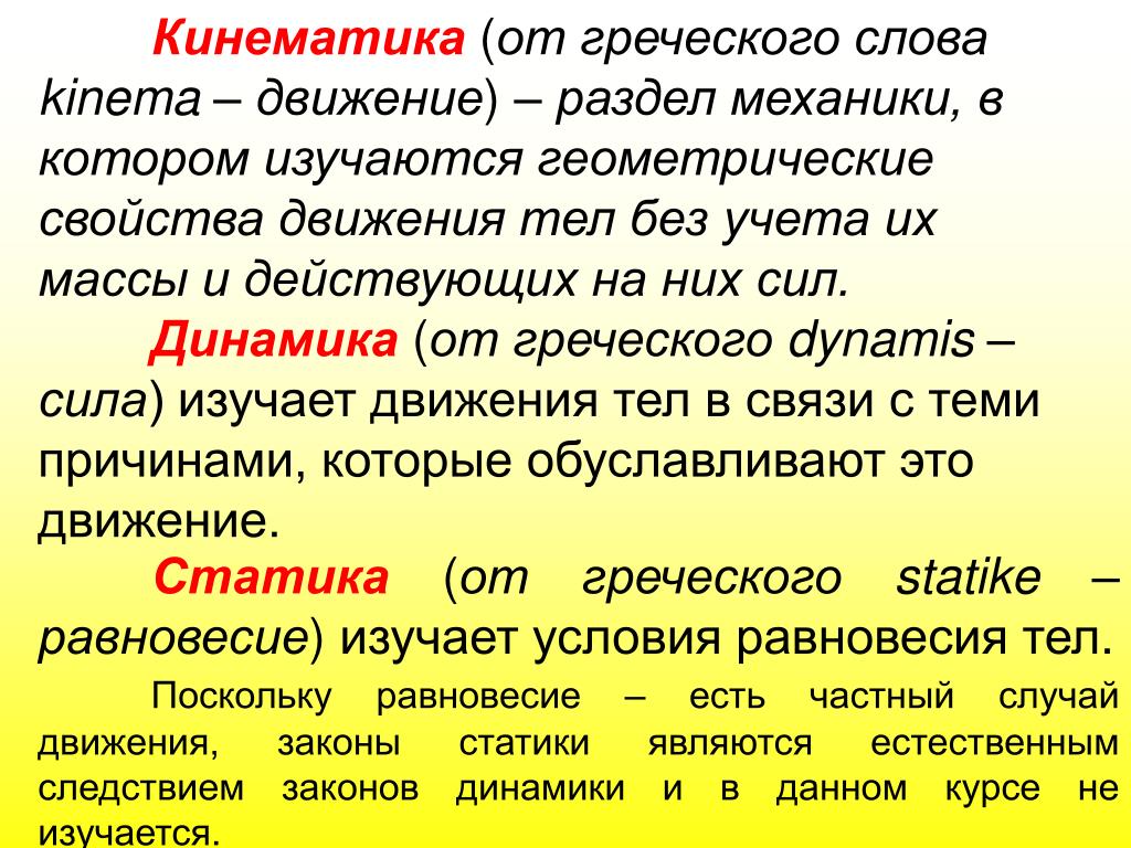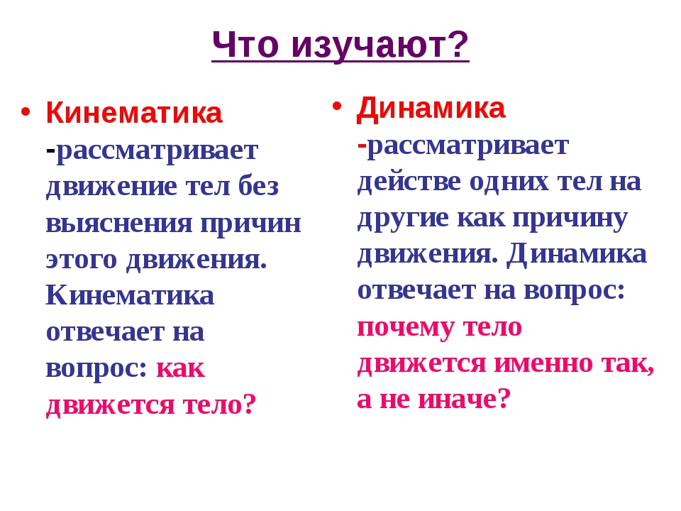 В кинематике изучают чисто геометрические формы механических движений материальных объектов без учега условий и причин, вызывающих и изменяющих эти движения. В динамике изучаются механические движения материальных объектов в зависимости от сил, г. е. от действия на рассматриваемые объекты других материальных объекюв.