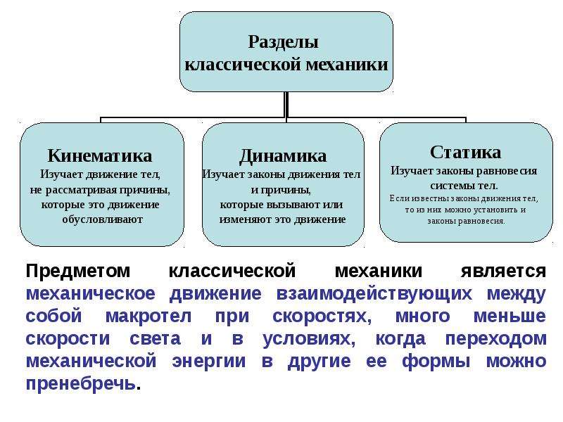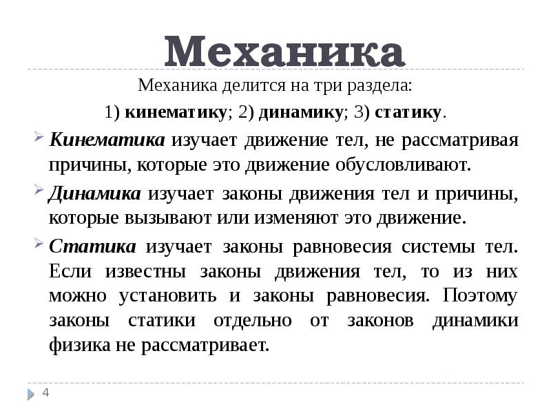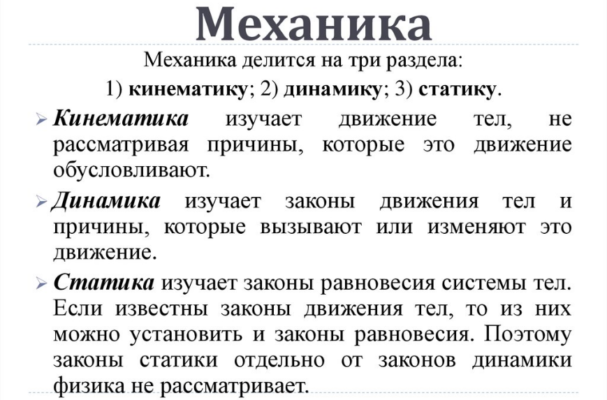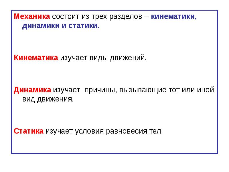 Прежде всего давайте проведем, так сказать, демаркационные линии между этими тремя понятиями. Механика является одним из физических разделов. О ней можно сказать, что сама механика занимается изучением законов перемещения тел. Но подобные определения читатель может встретить и тогда, когда речь идет о кинематике с динамикой.