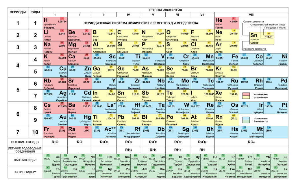 В длинной версии лантаноиды и актиниды удалены из общей таблицы, соответственно, как и в короткой версии, что делает ее более компактной. Нет главных и побочных подгрупп. Каждая точка занимает ровно один ряд. Рисунок 1. Первое, что мы видим, это сам символ элемента, под которым находится его название. В левом верхнем углу указан атомный номер элемента, в каком порядке он расположен в таблице. Атомный номер, как уже упоминалось, равен числу протонов в ядре. Число положительных протонов обычно равно числу отрицательных электронов в атоме (за исключением изотопов).