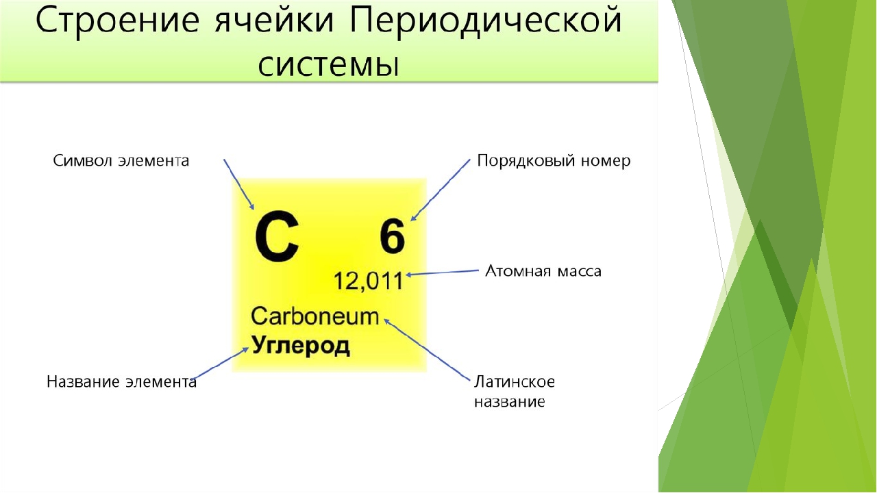 Обозначения элементовКаждый элемент обозначается одной или двумя латинскими буквами. Как правило, символ элемента приведен крупными буквами в центре соответствующей ячейки. Символ представляет собой сокращенное название элемента, которое совпадает в большинстве языков. При проведении экспериментов и работе с химическими уравнениями обычно используются символы элементов, поэтому полезно помнить их.