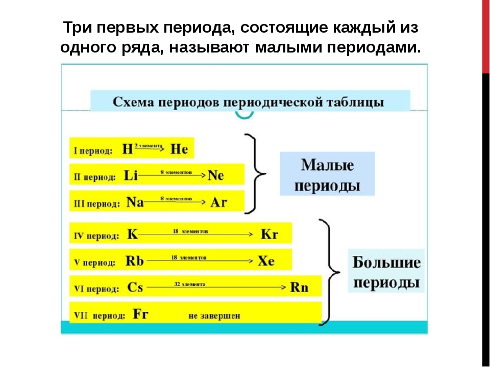 Строки периодической таблицы известны как периоды, всего их 7 периодов, каждый из которых содержит разное количество элементов.