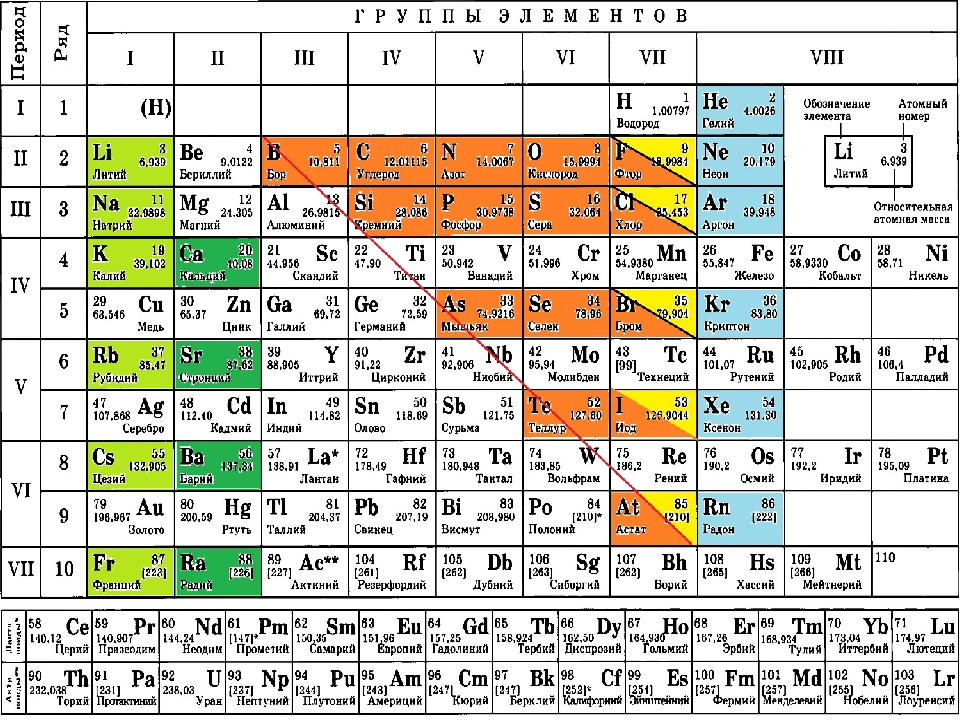 Периодическая таблица Менделеева на металлы, неметаллы и металлоиды.