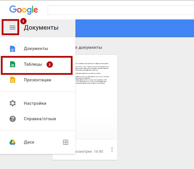 - Перейдите на главную страницу Документов Google и найдите кнопку меню-гамбургер слева.