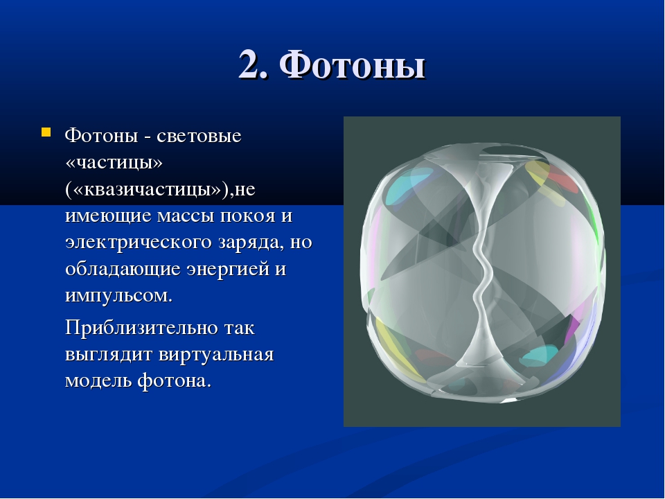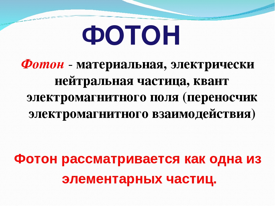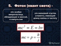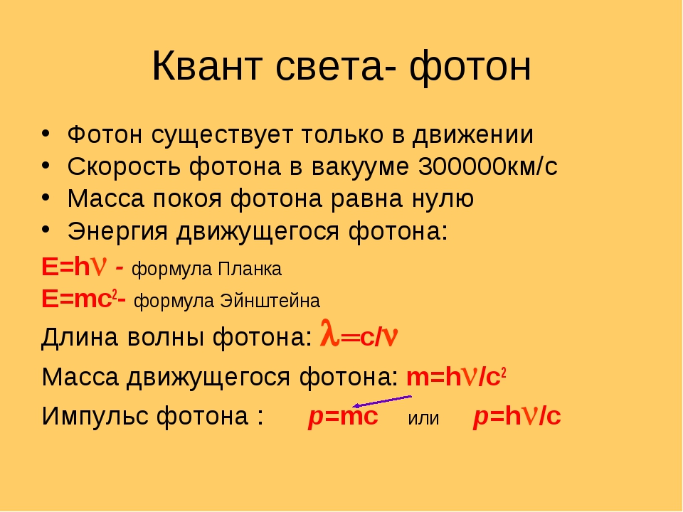 Или Эйнштейновское уравнение для безмассовых частиц. А кванты электромагнитных волн (включая все виды света: видимый, ультрафиолет, инфракрасный, радиоволны, гамма-излучение, и т.п., отличающиеся только частотой, и, следовательно, энергией квантов) и правда будут безмассовыми частицами – как только мы применим указанную выше пару уравнений (**) и (***). Это фотоны.
