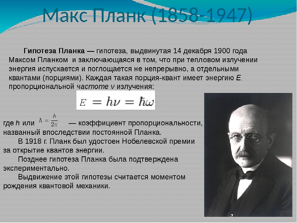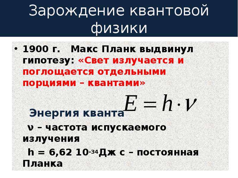 Зарождение квантовой теории произошло в 1900 году, когда Макс Планк выступил на заседании немецкого физического общества. Что тогда сообщил Планк? А то, что излучение атомов дискретно, а порция энергии этого излучения равна = ɦѴ, где ɦ – постоянная Планка, Ѵ – частота.