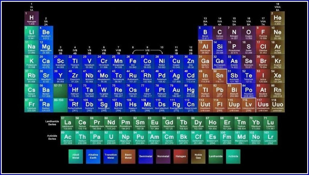 В настоящее время в таблице выделяют следующие группы: 1 – щелочные металлы, 2 – щелочноземельные металлы, 3 – подгруппа скандия, 4 – подгруппа титана, 5 – подгруппа ванадия, 6 – подгруппа хрома, 7 – подгруппа марганца, 8 – подгруппа железа, 9 – подгруппа кобальта, 10 – подгруппа никеля, 11 – подгруппа меди, 12 – подгруппа цинка, 13 – подгруппа бора, 14 – подгруппа углерода, 15 – подгруппа азота, 16 – подгруппа кислорода, 17 – галогены, 18 – инертные газы.
