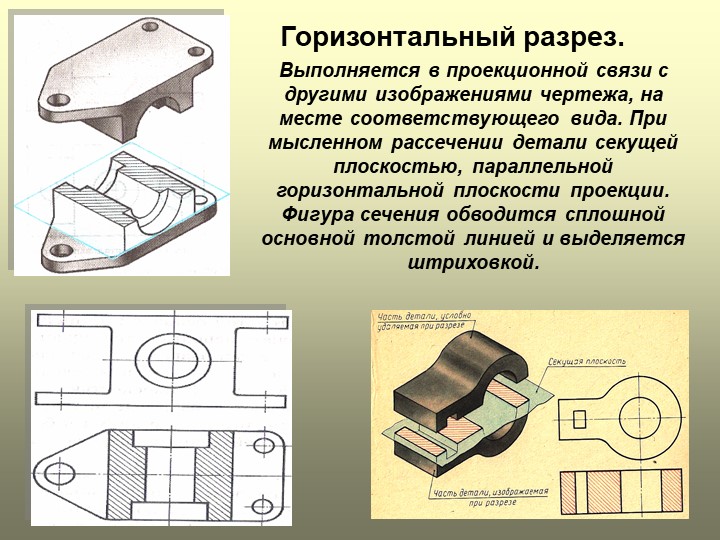 Если секущая плоскость расположена параллельно горизонтальной плоскости проекций, то разрез называется горизонтальным. Горизонтальный разрез может быть изображен на виде сверху и снизу или вынесен на свободное поле чертежа, если на виде сверху или снизу надо сохранить форму внешних поверхностей.