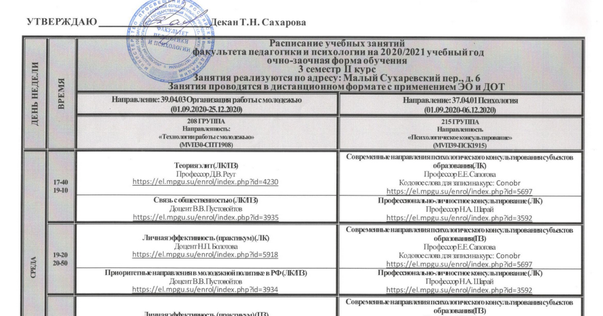 Корректировка расписанияПри рассмотрении вопроса об отчислении из-за конфликтов в расписании учащиеся должны обсудить свою ситуацию со своим научным руководителем, академическим деканом или в отделе регистрации, чтобы выяснить, можно ли внести какие-либо приспособления.