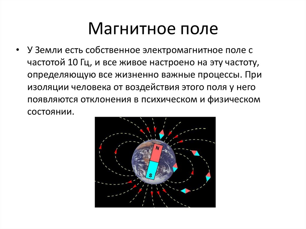 Слабые магнитные поля – техногенного и естественного происхождения – оказывают влияние на циркадные ритмы и физиологические функции человека, что в итоге сказывается на общем состоянии. В природных условиях человек подвержен лишь естественным электромагнитным полям, на которые он настроился на протяжении всего процесса эволюции на планете Земля. Когда же в этот процесс взаимодействия вмешиваются искусственные источники магнитных, электрических и электромагнитных полей, то просиходит нарушение синхронизации. В среднем магнитное поле Земли изменяется с частотой в среднем 8 Гц, хотя это значение может значительно колебаться. Наш организм уже настроен на то, чтобы воспринимать эту частоту и считает её естественным фоном.
