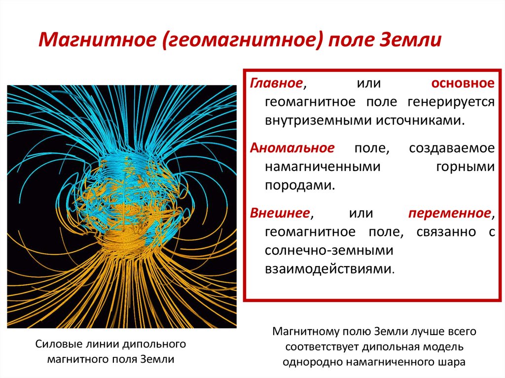 Отклонения Г. п. от поля диполя (шара) наз. аномалиями (см. Геофизическая аномалия).Г. п. характер неоднородной пространств. структурой и широким спектром вариаций. Это объясняется тем, что оно создаётся за счёт источников разл. природа. Возникновение осн. компонентов (96-99%) поля, согласно наиболее распространенной гипотезе, объясняется движением электропроводящего вещества в жидкой части ядра, к-по приводит к самовозбуждению главного магнитного поля (ГМП). Изменения ГМП состоят из глобальных, к-рым уменьшение магнитного момента со скоростью 25 нТа в год, смещение к З.(«зап. дрейф») со скоростью 0,2 ° в год и изменения (вековые вариации) c амплитудами 150-180 нТа в год, охватывающие крупные регионы. Xарактерное время вариаций ГМП от 20 до 2,4 · * 10 3 лет определяется из прямых наблюдений и археомагнитных данных; палеомагнитные наблюдения позволили выявить также смену полярности, т.н. инверсии, к-рые проходят через интервалы времени от 5 · * 10 5 до 5 · * 10 7 лет.