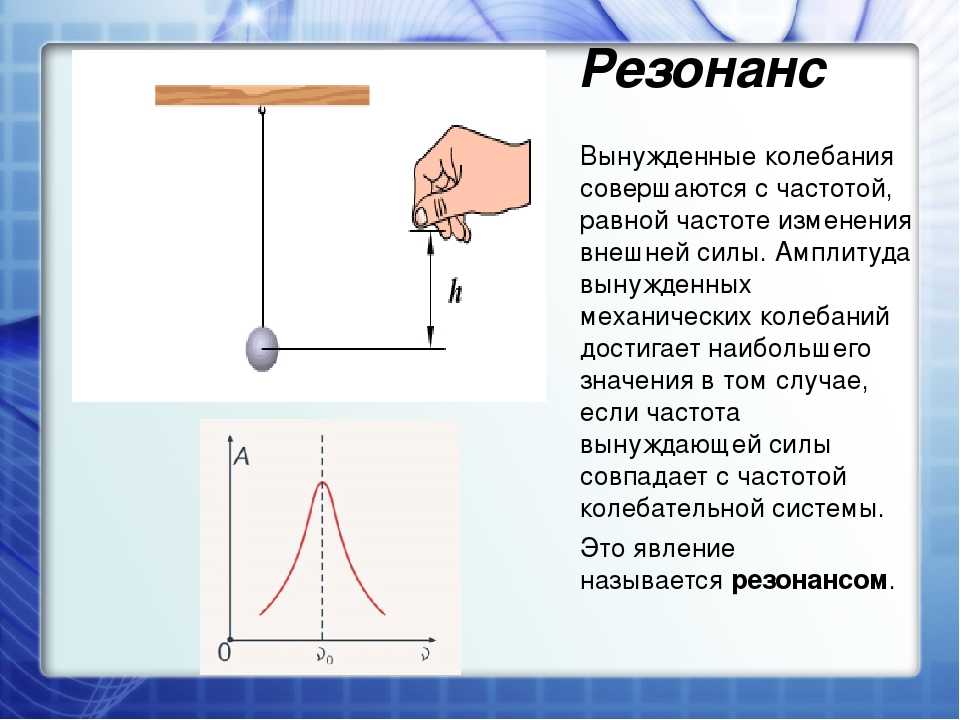 Периодическая внешняя движущая сила, действующая на систему, вызывает вынужденные колебания. Частота силы называется движущей частотой. Если она равна собственной частоте системы, это вызывает очень большие колебания, и в этот момент система находится в резонансе.