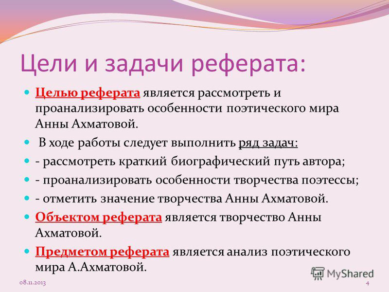 И только исходя из формулировки целей могут вытекать списки задач по ее реализации. Задачи реферата, дипломной или курсовой работы заключаются не только в описании теоретической части выбранной отрасли, но и должны определять связь с реальным производством или действующими исследованиями.