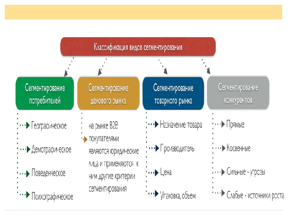 - Поведенческие характеристики: повод для совершения покупки, отношение к товару, доминирующие мотивы покупки, приверженность к определенным маркам, частота пользования конкретным товаром, способность откликнуться на новые товары на рынке