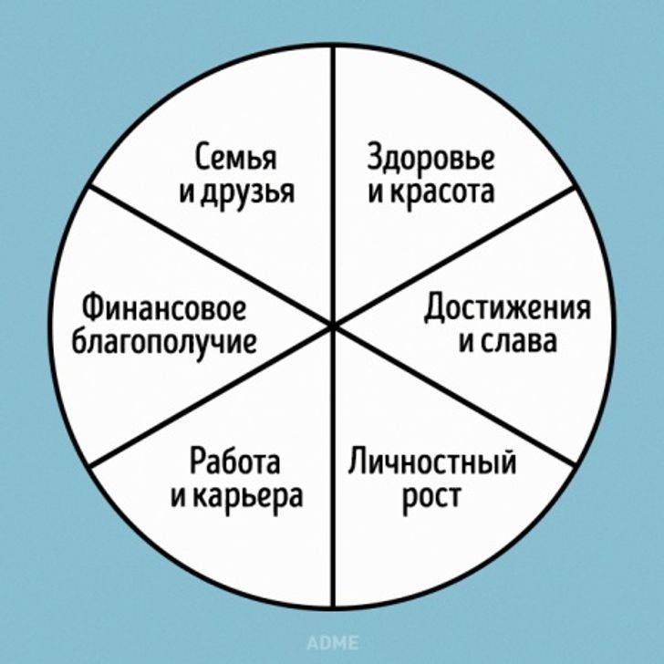 А теперь запишите пять сфер жизни: финансы и работа, образ жизни и хобби, отношения и социум, здоровье души и тела, креатив и саморазвитие. Можете добавить свои варианты.