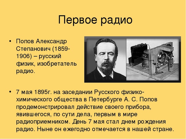 Первооткрывателем радиоволн был немецкий физик, основоположник фундаментальной электродинамики Генрих Герц. Он доказал гипотезу английского физика Джеймса Максвелла об их существовании, изложенную в 1864 году. В России первым человеком, осуществившим передачу радиосигнала, стал выдающийся физик и изобретатель Александр Попов. После публикации работ Герца Попов начал исследовать электромагнитные явления. Он следил за каждым шагом западных ученых, следовавших по пути Герца, тщательно изучал работы физиков Эдуарда Бранли и Оливера Лоджа, повторял проделанные и описанные ими опыты.7 мая (25 апреля по старому стилю) 1895 года на историческом заседании физического отделения Русского физико-химического общества в Санкт-Петербургском университете Попов продемонстрировал созданную им первую в мире искровую беспроводную приемо-передающую радиосистему, пригодную для надежного обмена информационными сигналами.
