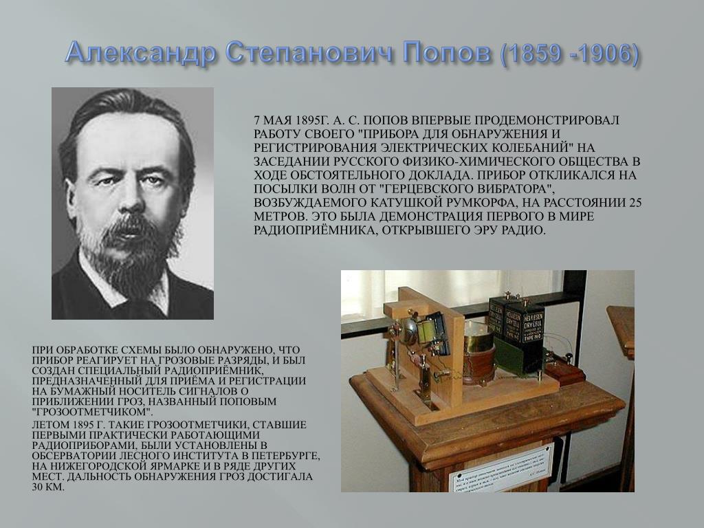 7 мая 1895 года Александр Степанович выступил на заседании Русского физико-химического общества в Санкт-Петербурге с лекцией «Об отношении металлических порошков к электрическим колебаниям», на которой, воспроизводя опыты Лоджа c электромагнитными сигналами, продемонстрировал прибор, схожий в общих чертах с тем, который ранее использовался Лоджем.
