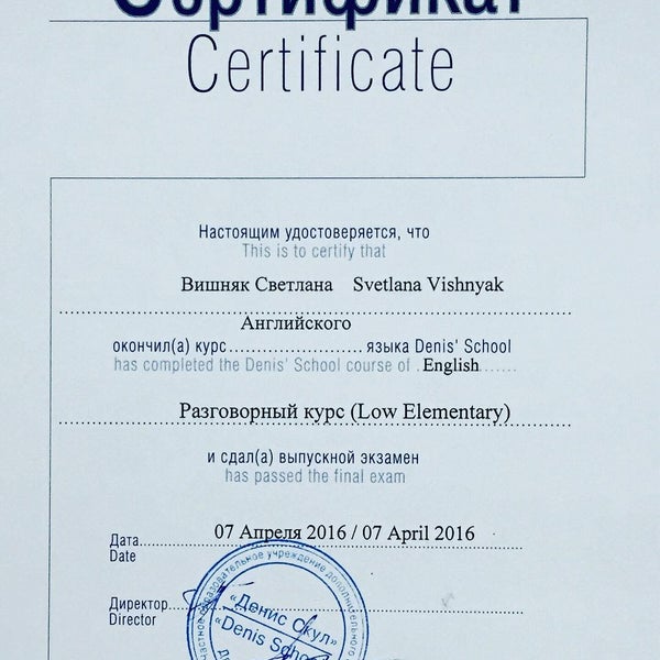 Хочу выразить благодарность всему коллективу Denis’ School и в особенности Васильевой Ларисе за профессиональный подход и невероятную выдержку и терпение.