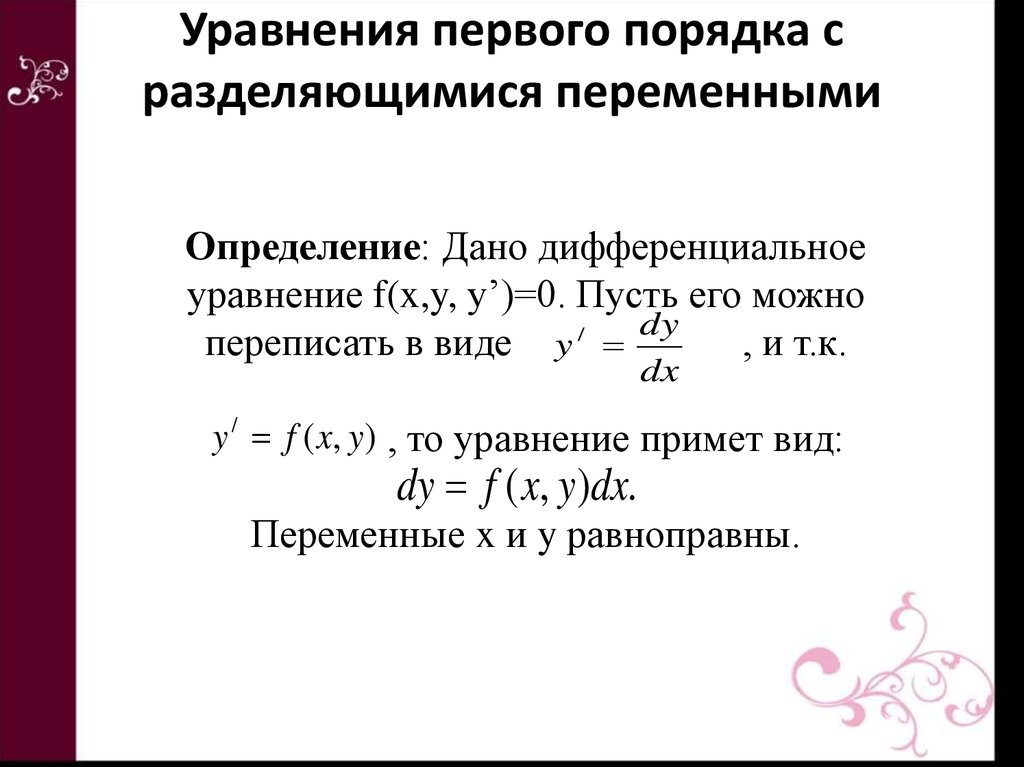 Записываем его в дифференциалах, далее сводим к уравнению с разделенными переменными и находим решение интегрированием